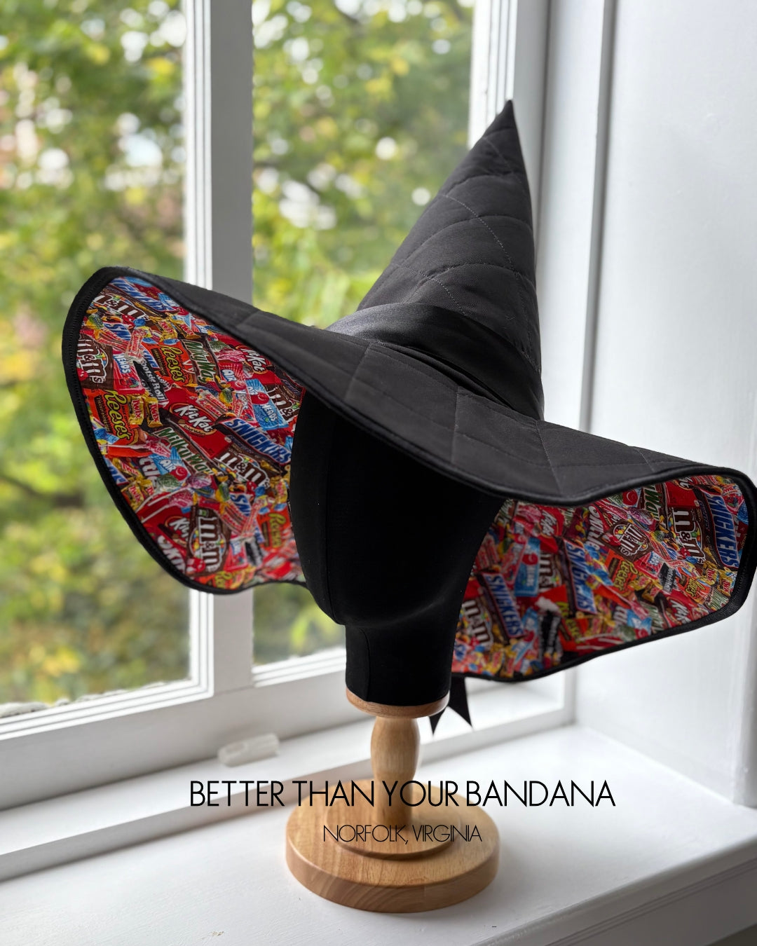 This 1 of 1 witch hat is handmade and quilted by Erin. Materials used to create this hat were sourced locally and from a small, female owned business in Orlando, Florida.
