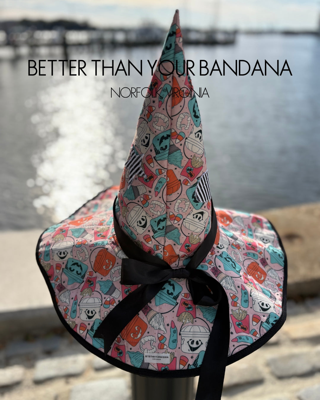 This witch hat is handmade and quilted by Erin. Materials used to create this hat were sourced locally and from a small, female-owned business in Bend, Oregon.
