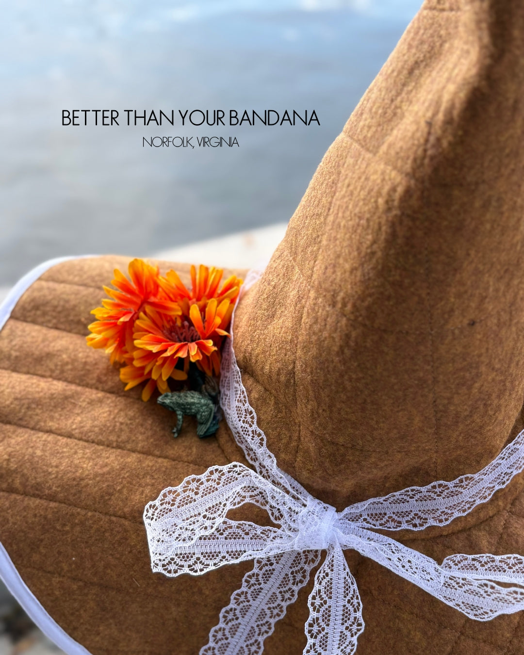 This witch hat is handmade and quilted by Erin. Materials used to create this hat were sourced locally.